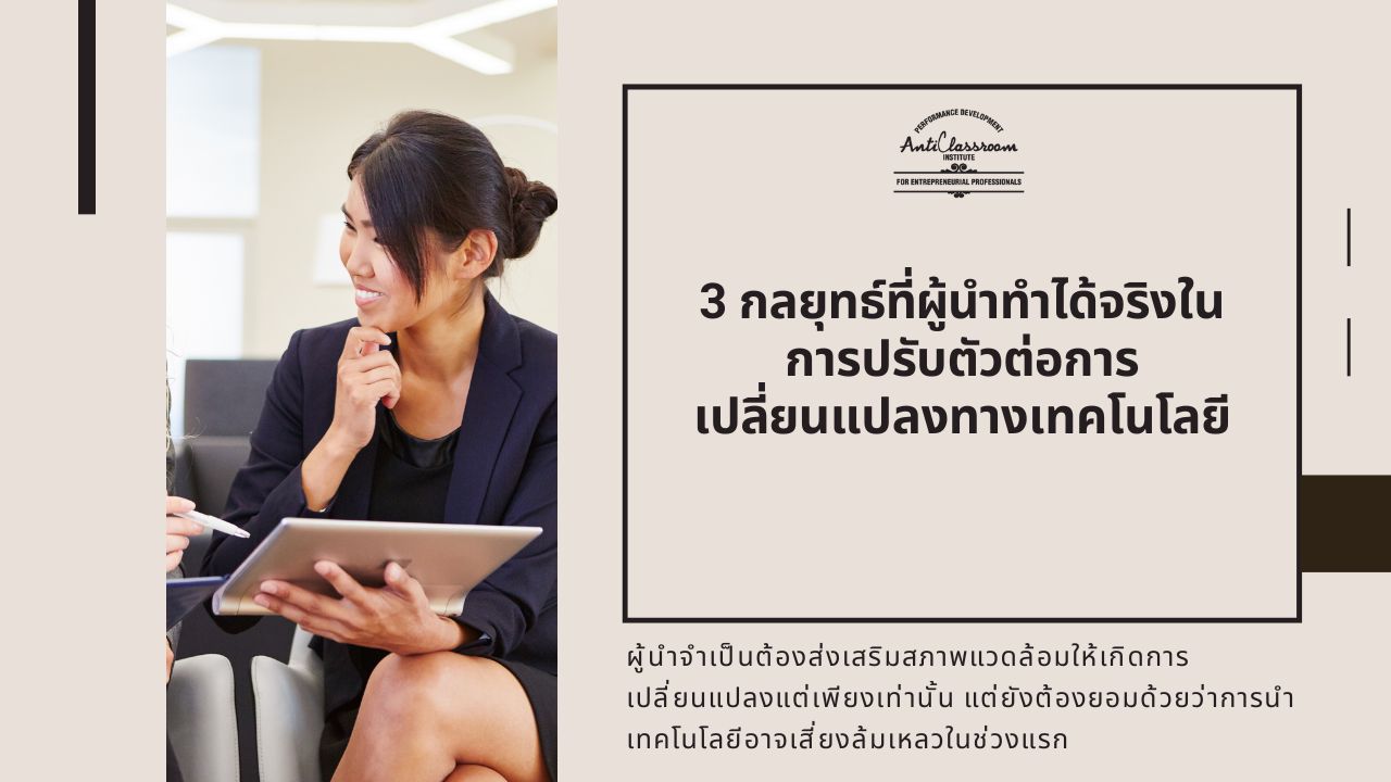 การปรับตัวให้เข้ากับการเปลี่ยนแปลงทางเทคโนโลยีถือเป็นสิ่งสำคัญของการเป็นผู้นำในธุรกิจยุคใหม่ ในขณะที่เทคโนโลยีพัฒนาไปอย่างรวดเร็วอย่างที่ไม่เคยมีมาก่อน ผู้นำจะต้องปรับปรุงทักษะและความรู้อย่างต่อเนื่องเพื่อให้มีความเกี่ยวข้องและมีประสิทธิภาพ วันนี้ AntiClassroom จะมาแบ่งปันวิธีการที่เราเชื่อว่าจะช่วยให้ผู้นำสามารถนำพาองค์กรในการปรับตัวได้อย่างเท่าทันเทคโนโลยี